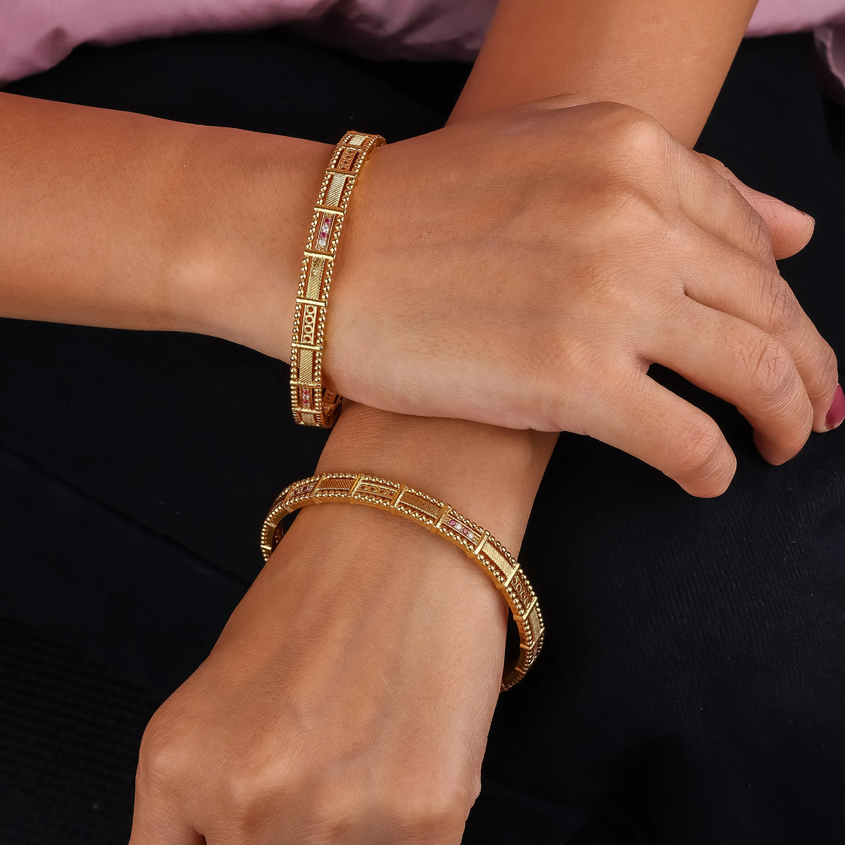 Elegant gold-plated kada bangles crafted with intricate rectangular motifs and studded accents. Designed for traditional and festive wear, these bangles enhance your ethnic look with timeless charm.