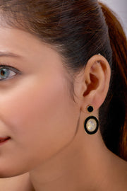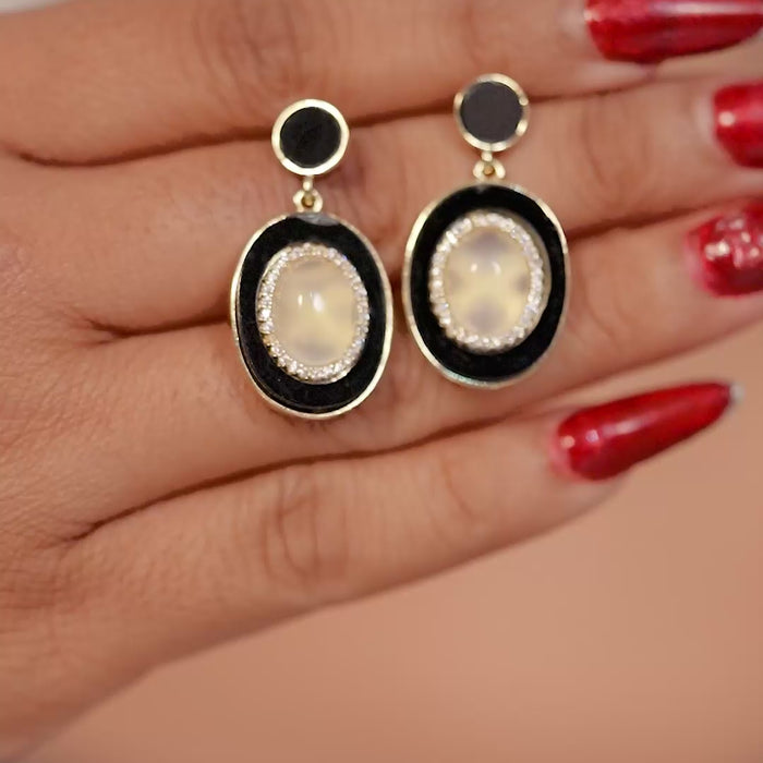 These are sophisticated two-tiered drop earrings with a striking black and white color scheme, giving them a classic, vintage, or Chanel-inspired look. The top component is a small, black circular stud that sits on the lobe. Suspended below is the main feature: a larger, ring-shaped dangle with a bright gold-tone frame. This ring surrounds a center stone, which appears to be a large, cabochon-cut white or pale iridescent stone (such as mother-of-pearl, opalite, or a light moonstone imitation), with a smooth, domed surface. The outer ring of the dangle is finished in a bold, solid black enamel or resin, creating a sharp contrast with the gold border and the pale center stone. This design offers a noticeable, chic statement without being overly large.