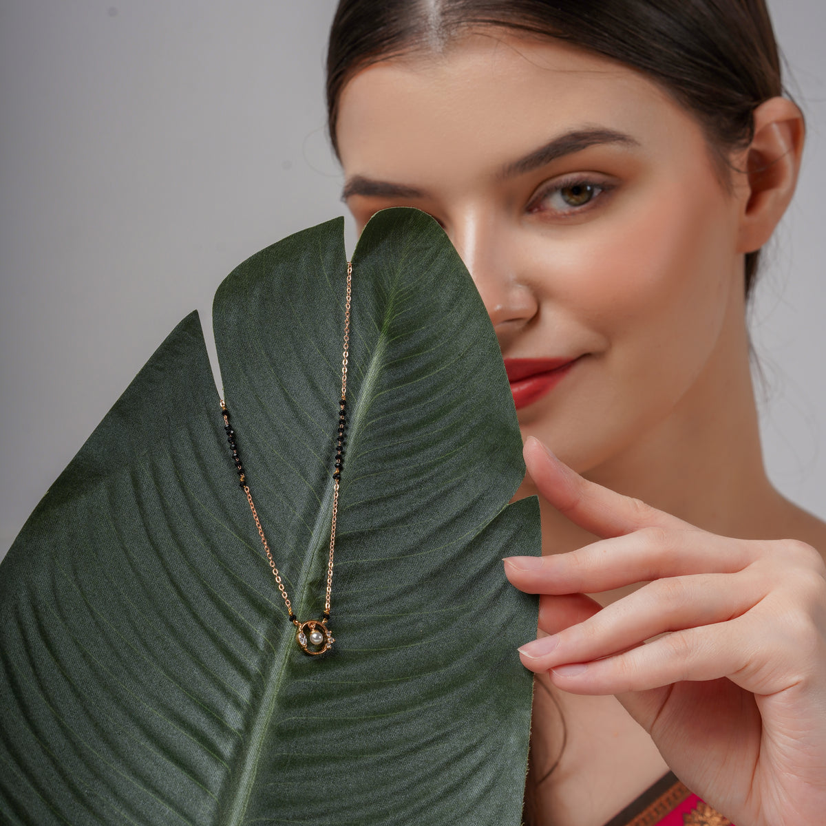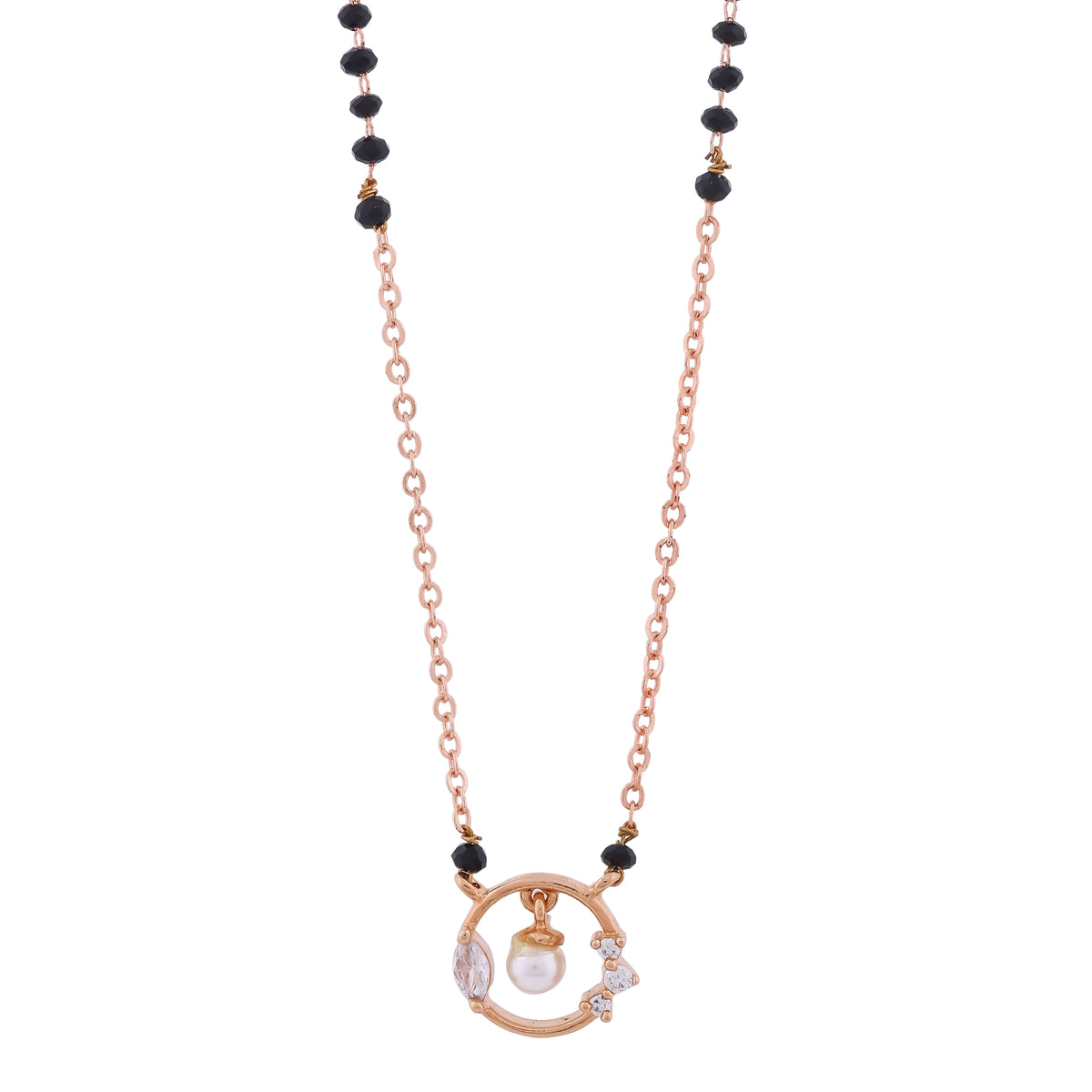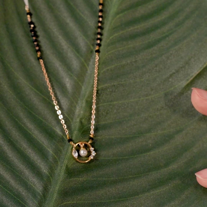 This chic mangalsutra features a circular pendant with a hanging pearl in the center, adorned with white stones for added elegance. A fusion of tradition and modern aesthetics, this piece is perfect for everyday elegance.