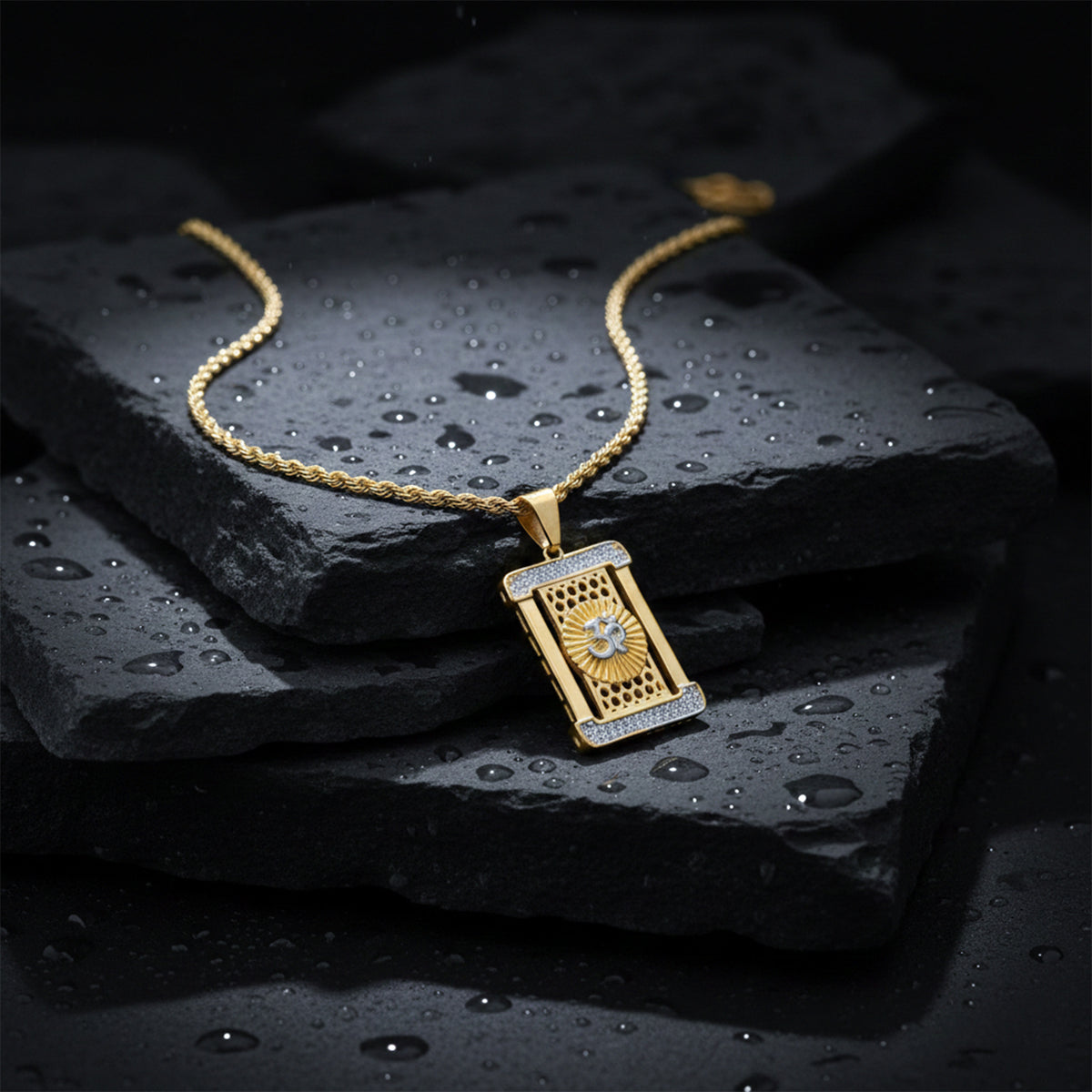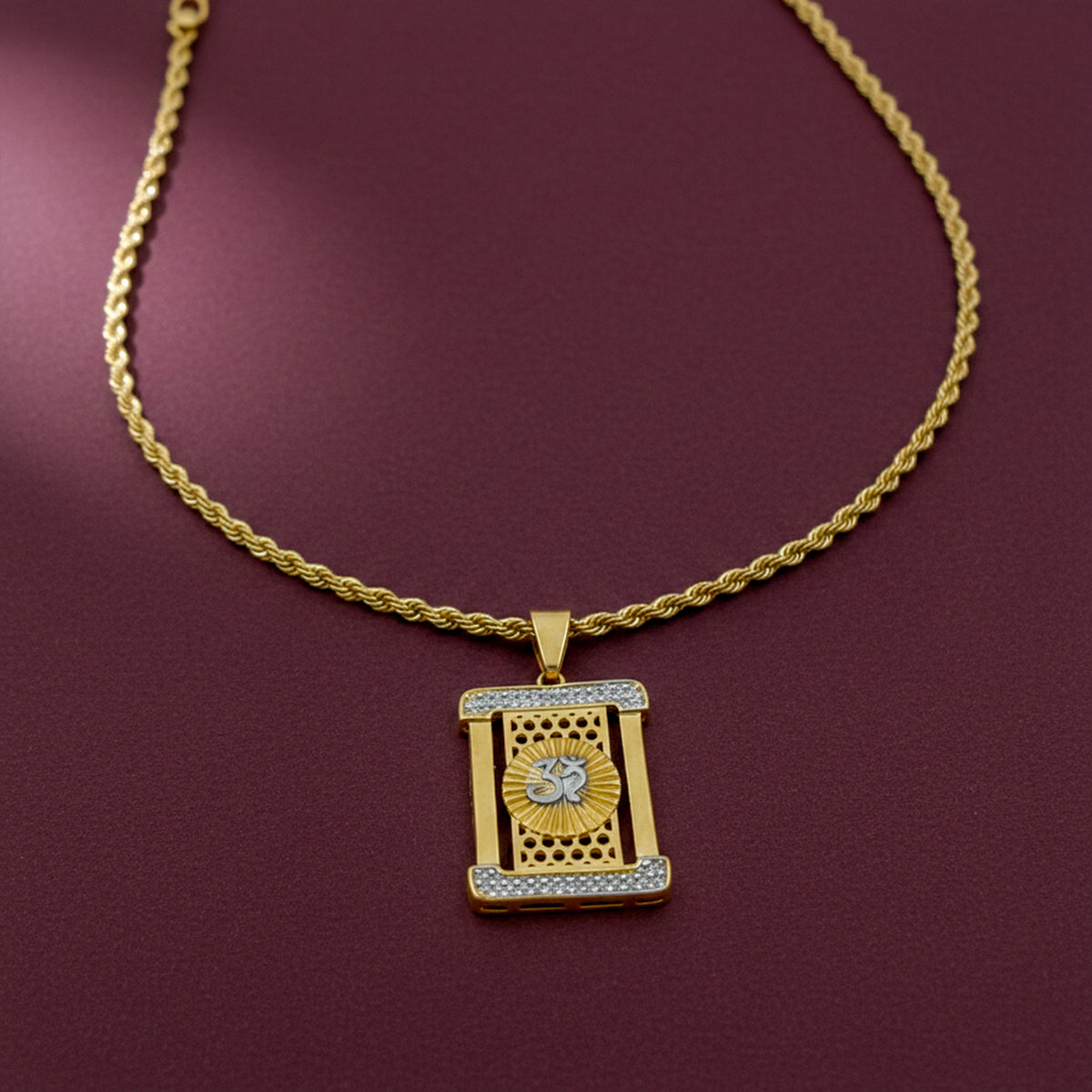 Designed with a rich gold-tone finish, the rectangular pendant showcases a honeycomb-inspired pattern, a radiant circular sunburst around the Om symbol, and stone-textured silver-tone accents on the top and bottom for a premium look. Paired with a classic twisted rope chain, this piece offers durability, comfort, and timeless elegance.