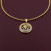 Finished in a rich gold tone, the pendant is enhanced with silver-tone stone detailing that adds a subtle sparkle and premium look. Paired with a strong twisted rope chain, this piece offers durability, comfort, and a bold presence for everyday wear.