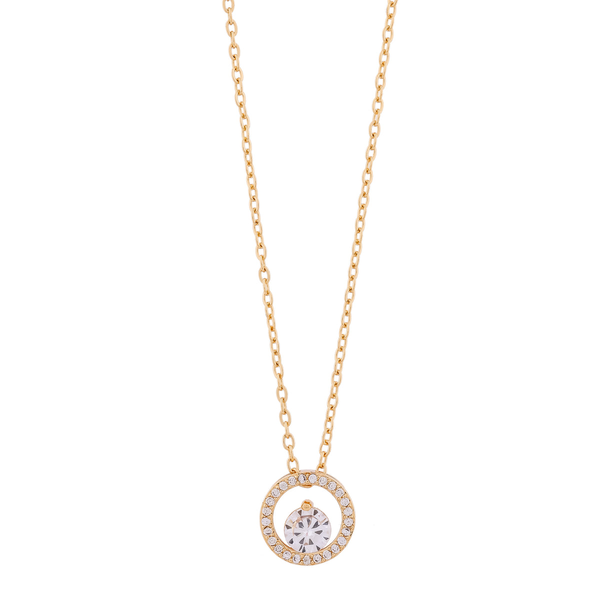 A delicate gold chain necklace featuring a sparkling circular pendant with a dazzling stone at its center, surrounded by a ring of small crystals, creating a timeless and elegant design.