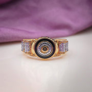 A sophisticated, wide-band men's ring with a striking, two-tone design. The centerpiece features a deep black enamel background highlighting a concentric circle or 'eye' motif in gold, framed by layers of brilliant, pavé-set stones that extend down the ring's shoulders.
