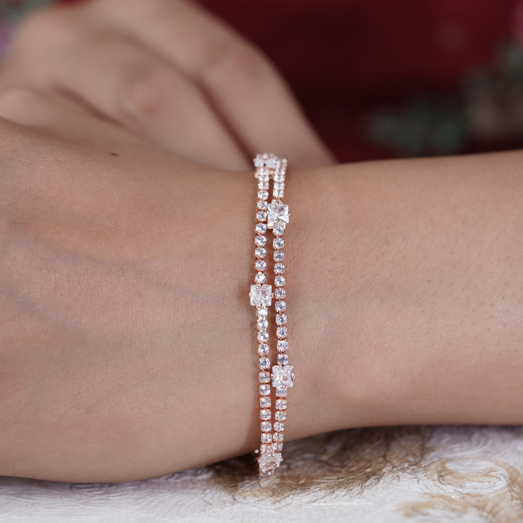 This is a stunning Rose Gold-Toned Tennis Bracelet featuring a continuous, flexible line of clear, uniformly sized, pavé-set clear stones. The fluid design is securely fastened by a reliable, integrated box clasp for a seamless, elegant finish.