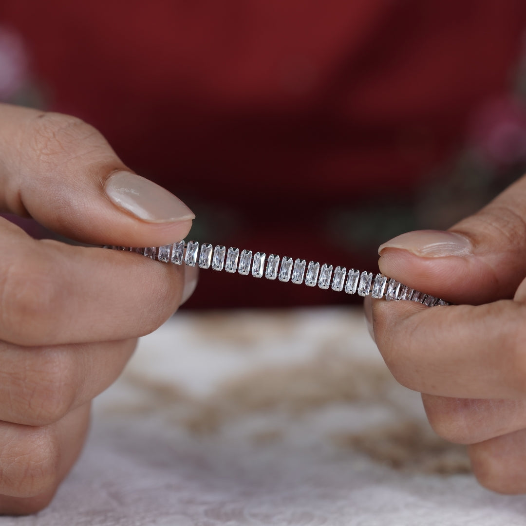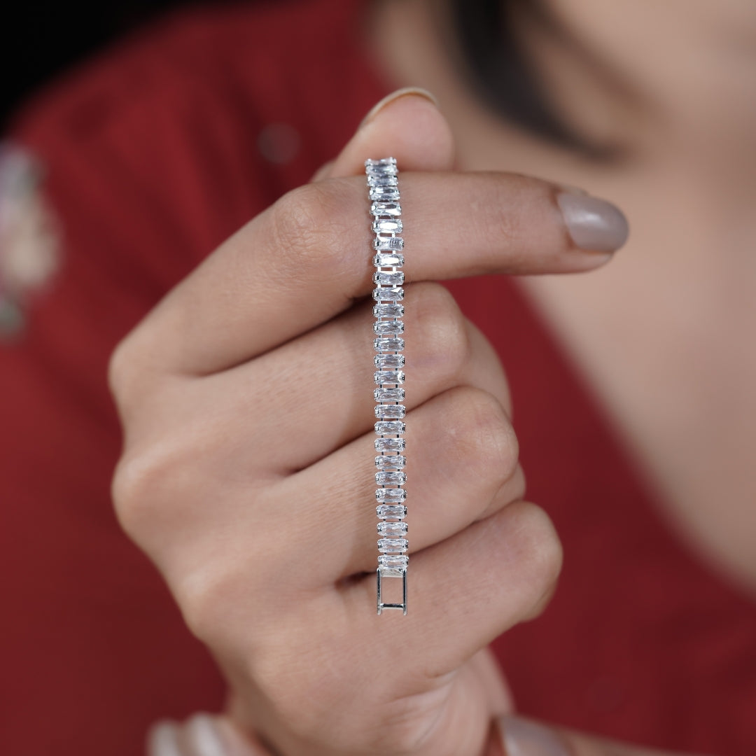 This is a stunning Silver-Toned Tennis Bracelet featuring a continuous, flexible line of rectangular-cut (baguette or emerald-cut) clear crystals. The linear, streamlined design is secured by a reliable, concealed box clasp for a seamless, luxurious finish.