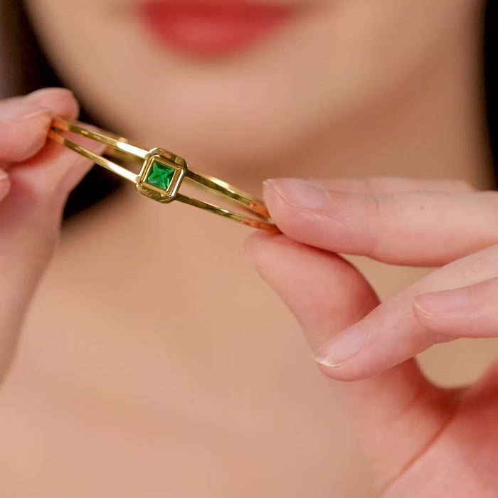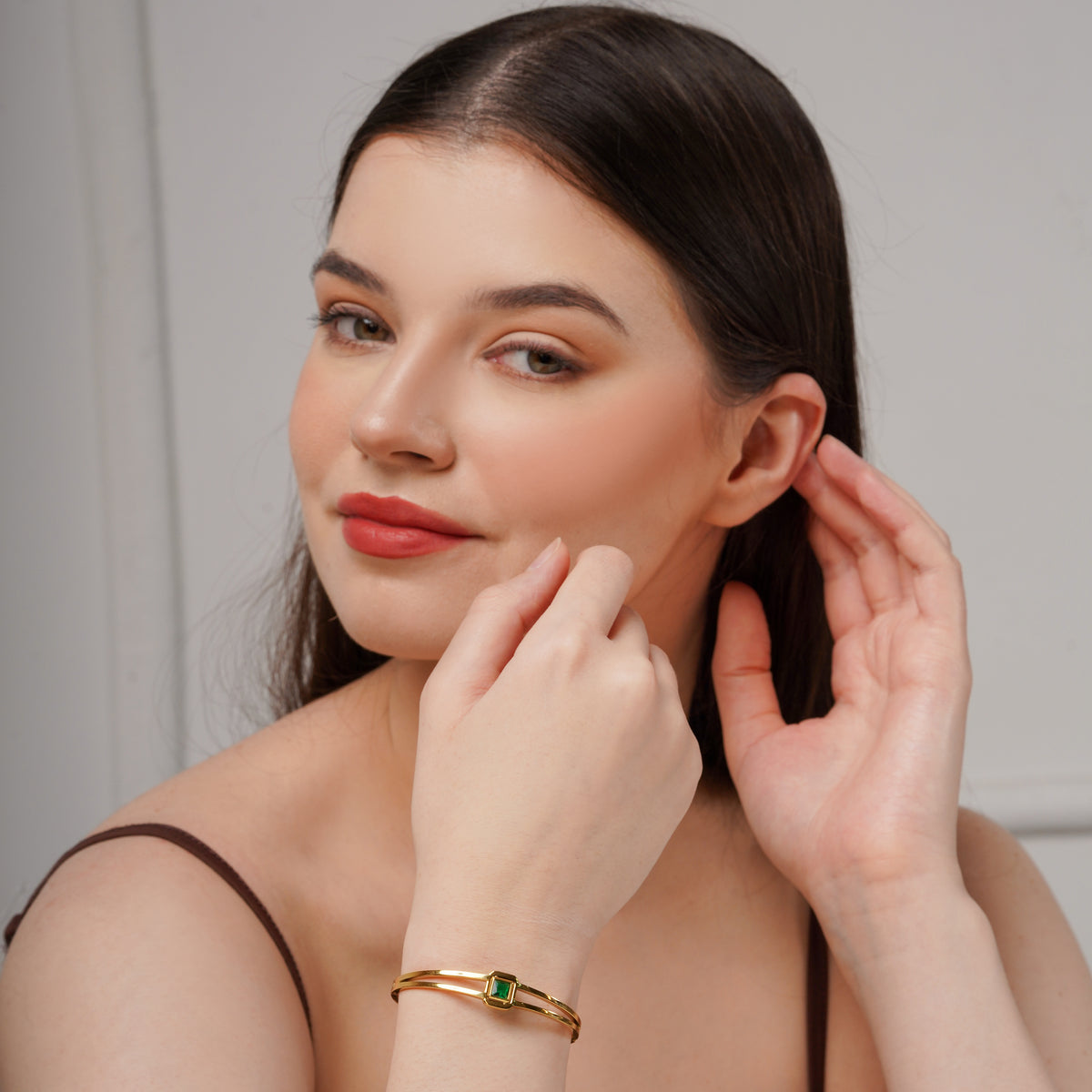 A sophisticated, gold-toned kada bracelet featuring a minimalist, open-cuff design with two sleek bands. It is elegantly centered with a single, square-cut, vibrant green gemstone, offering a timeless blend of classic elegance and contemporary simplicity.